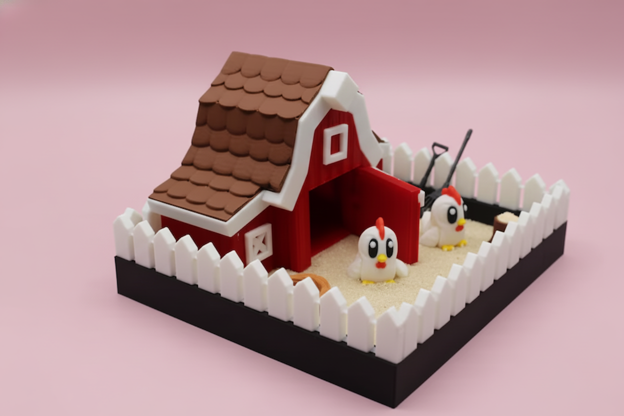 Add cozy countryside charm to your workspace with this Chicken Farm Zen Garden Desk Decor, a cute 3D printed chicken coop mini sand garden designed for relaxation and mindful desk breaks. Featuring adorable chicken figurines, a classic red barn coop, white picket fence, and decorative sand, this desktop zen garden and stress relief fidget sandbox helps you unwind and refocus during busy workdays.