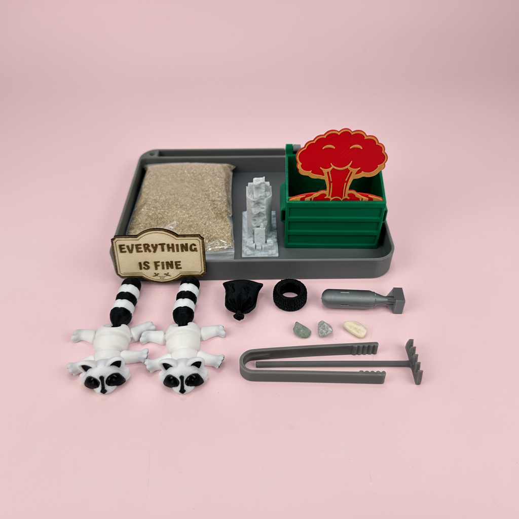 Add humor and relaxation to your workspace with this Dumpster Fire Style Mini Zen Garden. This miniature Zen garden features a playful dumpster scene with a smiling mushroom cloud, an “Everything Is Fine” sign, raccoon figurines, small props, fine sand, and a mini rake for creating calming patterns.